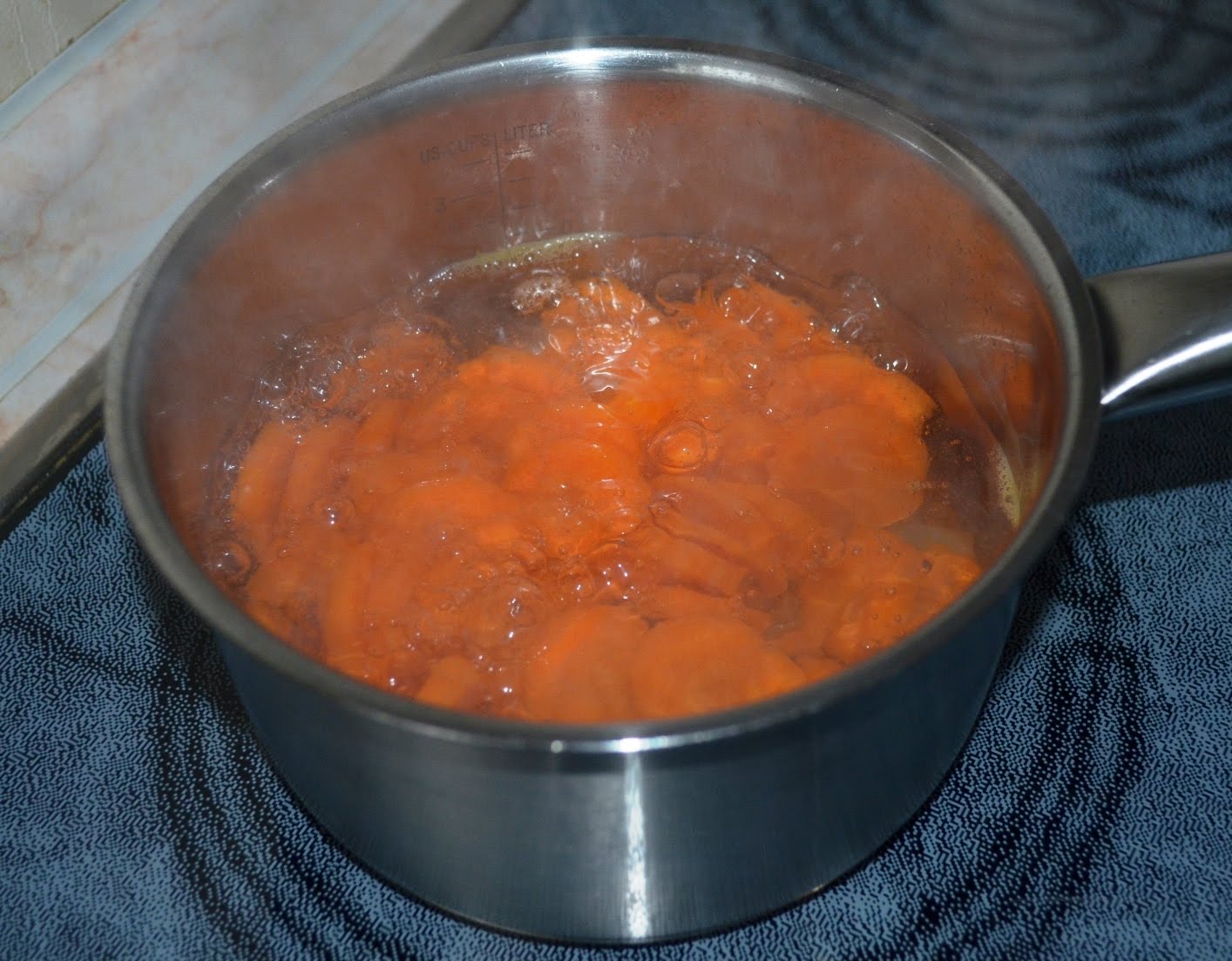 кольцами. Положите морковь в кастрюльку, залейте кипятком, поставьте на огонь,